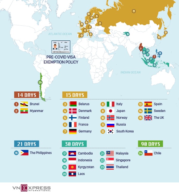 베트남이슈 베트남, 비자 면제 대상 국가 24개국 페이지 정보 댓글 0건 작성일 22-03-18 10:20 본문 베트남에서 3월 15일부터 코로나 펜데믹 이전의 비자 정책을 재개한다고 발표함에 따라 기존에 비자 면제 혜택을 받던 24개국은 아래와 같다. [이미지 출처: VnExpress] 추천0 페이스북 공유 트위터 공유 구글+ 공유 검색 목록 댓글목록 댓글목록 등록된 댓글이 없습니다.