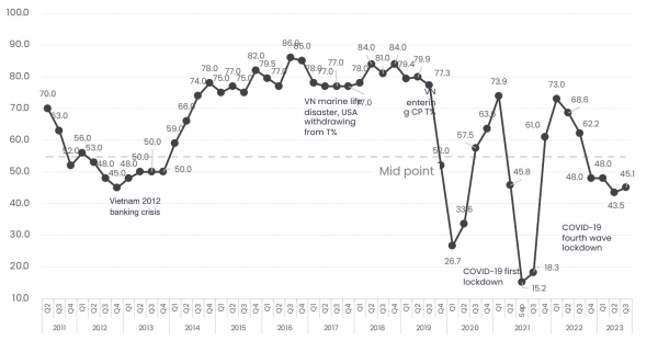 주베트남유럽상공회의소(EuroCham·유로참)가 베트남내 유럽기업을 대상으로 조사한 3분기 기업신뢰지수​​(Business Confidence Index, BCI) 보고서에 따르면, BCI는 전분기대비 1.6p 상승한 45.1로 유럽기업 사이에서 베트남 경제에 대한 낙관적 전망이 확산되고 있는 것으로 풀이됐다.
