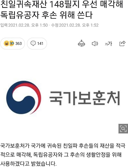 이슈 삼일절에 딱 맞는 소식 페이지 정보 댓글 0건 작성일 21-03-02 11:40 본문 삼일절에 딱 맞는 소식 국가에 귀속되있는 친일파재산 팔아서 독립유공자와 그 후손 생활안정을 위해 사용 추천0 페이스북 공유 트위터 공유 구글+ 공유 목록 댓글목록 댓글목록 등록된 댓글이 없습니다.
